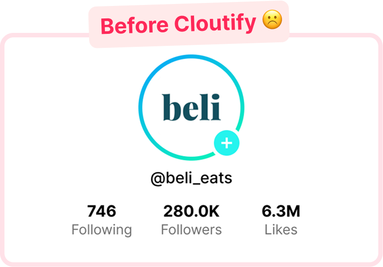 Working with Cloutify made a significant impact for Beli Eats because the AI targeting helped drive more organic viewership on promotional content. Beli Eats was able to share restaurant recommendations, new sales, and more to an audience that was genuinely interested in finding new places to eat. They also were able to target followers that were specific to their most common hubs for business, and all without needing to hire an entire organic marketing team. The results has been a 2x increase in sales, over 35% more followers, and much higher engagement rates than Beli Eats had before Cloutify.